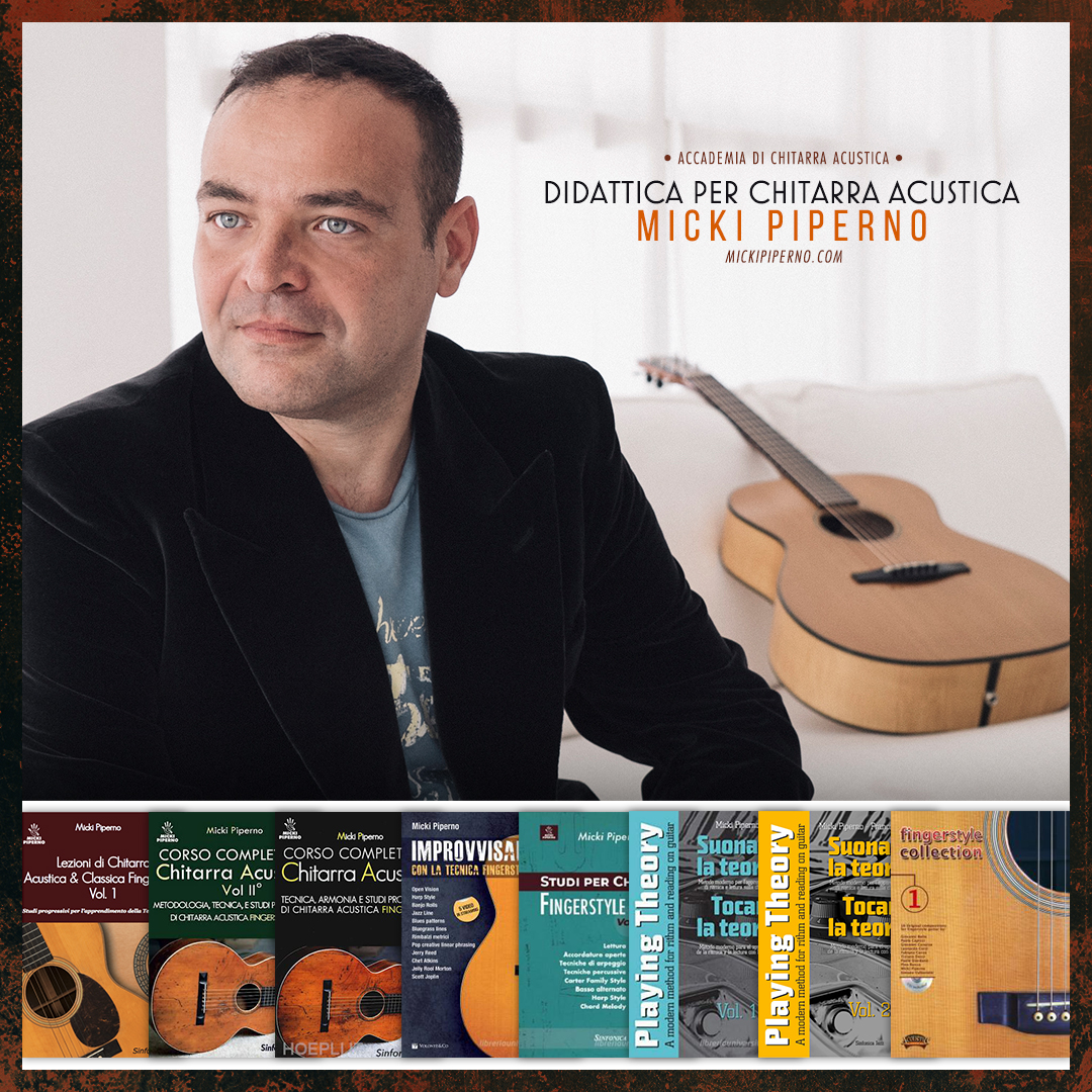 Micki Piperno per tua informazione è autore di molti metodi dedicati alla didattica per chitarra, è inoltre il primo docente in Italia a tenere un corso ufficiale di Chitarra Acustica Pop ad indirizzo Fingerstyle presso il Conservatorio Gaetano Braga di Teramo e di Chitarra folk presso il Conservatorio Alfredo Casella dell’Aquila nel nuovo dipartimento di Musiche tradizionali.